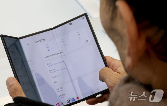 갤럭시 Z 트라이폴드가 출시된 12일 오전 서울 서초구 삼성 강남을 찾은 어르신이 제품을 살펴보고 있다. 2025.12.12/뉴스1 © News1 장수영 기자