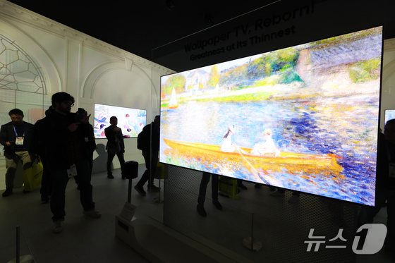 세계 최대 IT(정보기술)·가전 전시회 'CES 2026' 개막을 하루 앞둔 5일(현지시간) 미국 네바다주 라스베이거스 컨벤션센터(LVCC)에서 열린 LG전자 사전 부스투어에서 관람객들이 9㎜대 두께를 구현한 무선 월페이퍼 TV를 살펴보고 있다. 2026.1.6/뉴스1 © News1 황기선 기자