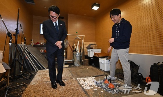 문화컨텐츠 현장 방문에 나선 김민석 국무총리가 15일 경기 성남시 넥슨에서 게임 속 효과음 제작 과정을 체험하고 있다. (공동취재) 2026.1.15/뉴스1 © News1 박정호 기자