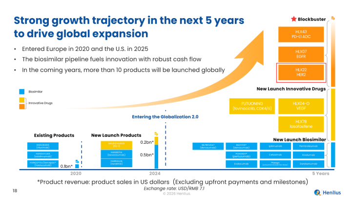 헨리우스는 이르면 2028년 HLX22의 해외 출시가 가능할 것으로 전망하고 있다. 매출 목표치는 100억달러(14조6400억원)으로, 여기에는 글로벌 위암 임상 3상과 HER2-저발현 유방암 임상 2상의 가치만 포함됐으며, HER2 양성 유방암 임상 개시에 따른 가치가 포함되지 않았다.