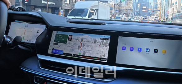르노 필랑트 동승석 쪽 디스플레이를 통해 동승자는 기본적인 검색을 할 수 있다. 3월 국내 공식 출시 후에 좀 더 다양한 앱이 탑재될 전망이다.(사진=윤정훈 기자)