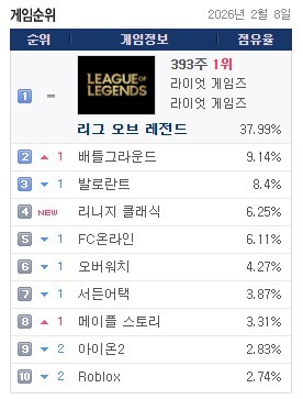 2월 8일 기준 PC방 게임 점유율 순위(게임트릭스 갈무리)/뉴스1