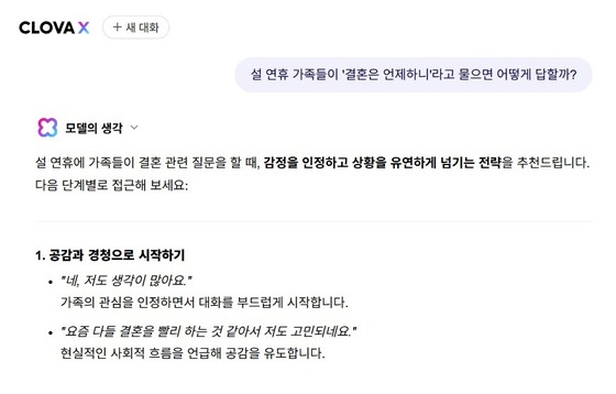 마지막으로 결혼에 대한 조언도 잊지 않았다. 클로바 X는 "결혼은 인생의 중요한 결정이니 주변의 말보다 본인의 마음이 우선이라는 걸 잊지 말라"며 "내 삶은 내가 주도한다"는 마음가짐으로 당당하되 공격적이지 않게 답변하라"고 답했다.