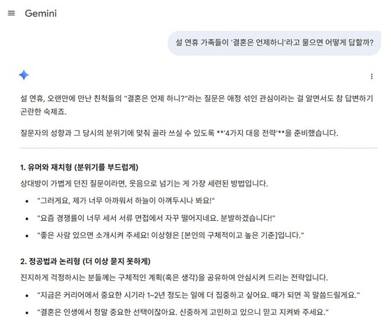 제미나이는 "계속해서 선을 넘는 질문이 이어진다면 정중하지만 확실하게 의사를 표현해야 한다"며 '걱정해 주시는 마음은 감사하지만 이런 질문을 받으면 명절이 조금 부담스러워지네요'라는 답변을 제시했다.