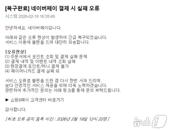 네이버페이는 19일 낮 12시쯤부터 결제 시스템에서 발생한 오류를 이날 3시 30분쯤 긴급 복구했다고 공지했다.