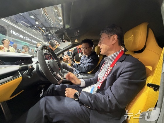 정재헌 SK텔레콤 사장이 2일(현지시간) 스페인 바르셀로나에서 열린 MWC26에서 샤오미 전시장을 방문해 'SU7 울트라'를 탑승하고 있다. 2026.03.02 © 뉴스1 김민수 기자