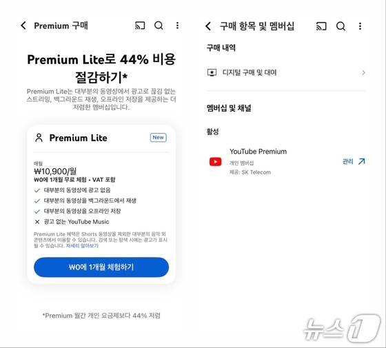 유튜브 프리미엄 멤버십을 구독하지 않는 이용자가 유튜브 앱을 통해 '멤버십' 페이지로 접속했을 때는 유튜브 프리미엄 라이트 멤버십을 바로 구독할 수 있도록 안내하지만(왼쪽), 이미 유튜브 프리미엄 멤버십을 구독하는 이용자가 앱을 통해 같은 페이지로 접속하면 유튜브 프리미엄 라이트 멤버십을 확인할 수 없다. (유튜브 앱 갈무리)