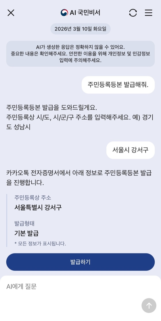카카오 'AI 국민비서'에 주민등록등본 발급을 요청한 모습 (국민비서 구삐 갈무리)