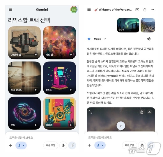 음악 분위기를 텍스트로 설명하거나 트랙 스타일을 선택하는 방식은 비슷했지만, 리리아 3는 제미나이 앱 이용자라면 챗봇을 이용하다가 모드만 바꿔서 음악을 만들 수 있어 간편했다.