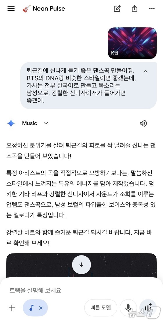 리리아 3에 좀 더 복잡한 요청을 해 봤다. K팝 트랙을 선택하고 BTS의 곡 'DNA'와 유사한 분위기, 남성 목소리, 강렬한 신디사이저, 한국어 가사 등 조건을 첨부한 결과 음악은 몇 초 내로 빠르게 제작됐지만 일부 조건이 누락됐다. 2026.03.13.© 뉴스1 신은빈 기자 (제미나이 내 '리리아 3' 실행 화면 갈무리)