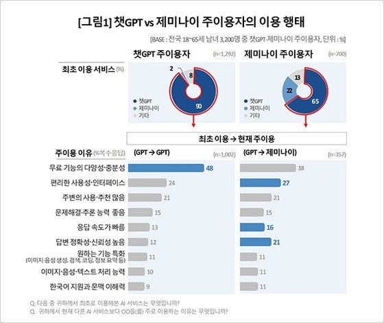 컨슈머인사이트가 1월부터 4주간 실시한 '주례 생성형 AI 소비자 동향조사'에 따르면 제미나이 주 이용자의 65%가 처음 이용해 본 AI 서비스는 챗GPT로 나타났다.