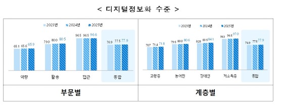 계층별 디지털 정보화 수준은 모든 계층에서 고른 향상을 보였다. 고령층은 지난해보다 0.4%p 상승한 71.8%, 농어민과 장애인은 0.6%p 상승해 각각 80.6%, 84.1%로, 저소득층은 0.5%p 상승한 97.0%로 조사됐다.