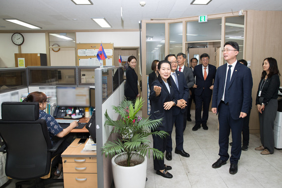 류제명 과학기술정보통신부 제2차관과 정구창 성평등가족부 차관이 16일 오후 서울 마포구 한국건강가정진흥원 다누리콜센터를 방문해 '다누리콜센터' 에 대한 설명을 듣고 있다. (과기정통부 제공)