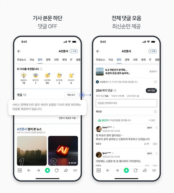 네이버는 이달 중 뉴스 페이지에 악성 댓글 자동 차단 시스템을 적용한다. AI 클린봇 차단 시스템을 기반으로 악성 댓글 비중이 일정 기준을 초과하는 모든 섹션 기사의 댓글창을 자동으로 닫는다. 이 경우 댓글 작성과 열람이 아예 불가능하다.
