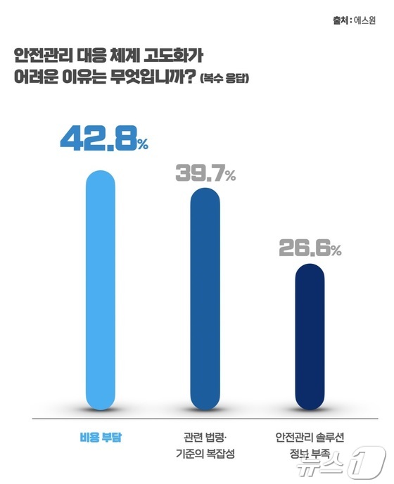 "중소기업 산업현장 안전관리 현황과 인식" 설문에서 안전관리 대응 체계 고도화의 어려움으로는 비용 부담(42.8%), 관련 법령·기준의 복잡성(39.7%), 안전관리 솔루션 정보 부족(26.6%)이 꼽혔다. (에스원 제공)