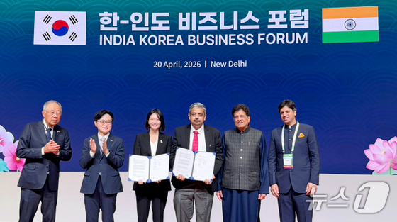 류진 한국경제인연합회 회장(왼쪽부터), 김정관 산업통상부 장관, 최수연 네이버 대표, 우주왈 마투르 TCS 대표, 피유시 고왈 상공부 장관과 아난트 고엔카 인도상공회의소연합회 회장이 20일(현지시간) 인도 뉴델리 한-인도 비즈니스 포럼에서 진행된 네이버-TCS MOU 맺고 기념촬영을 하고 있다. (네이버 제공. 재판매 및 DB 금지) 2026.4.20 © 뉴스1